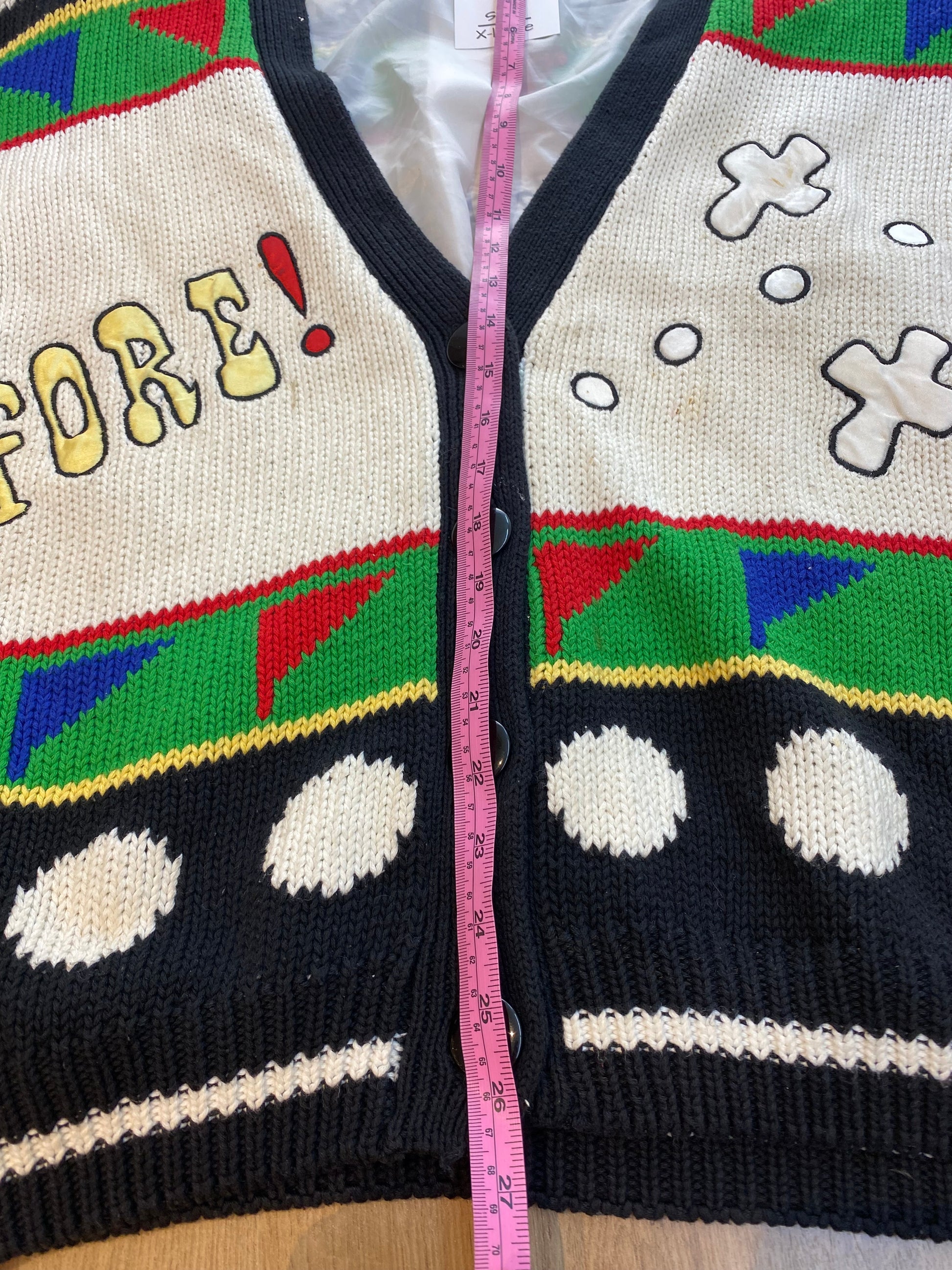 Standout vintage Funsport knit sweater featuring bold golf-inspired graphics, bright primary colors, and oversized fit. Classic 80s/90s retro style with button front and playful design details—perfect statement piece for golf lovers or vintage streetwear fans.